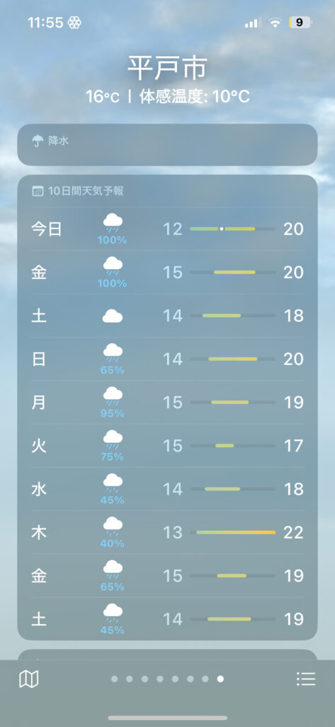 (アップルの降水確率100%ほど信じられるものはない。100%だったものが1時間後に見ると0%に変わってたりするし、その逆もまたある。ふんっ!)